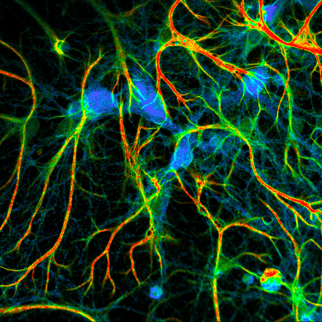 FLIM image of fixed primary neuronal cells stained for synapses (PSD95), intermediate filaments (GFAP), and mitochondria (TOM20). Sample courtesy of the Rizzoli Group, Department of Neuro- and Sensory Physiology, University of Göttingen Medical Center.Neuronal function emerges from tightly regulated cellular mechanisms that operate on fast timescales and within highly confined spatial environments. Studying these processes at the cellular level is essential for understanding how synaptic transmission and plasticity support learning, adaptation, and information processing. Disruption of cellular signaling pathways is closely linked to neurological and neurodegenerative diseases, making cellular neuroscience critical for connecting molecular dysfunction to altered neural behavior and pathology.