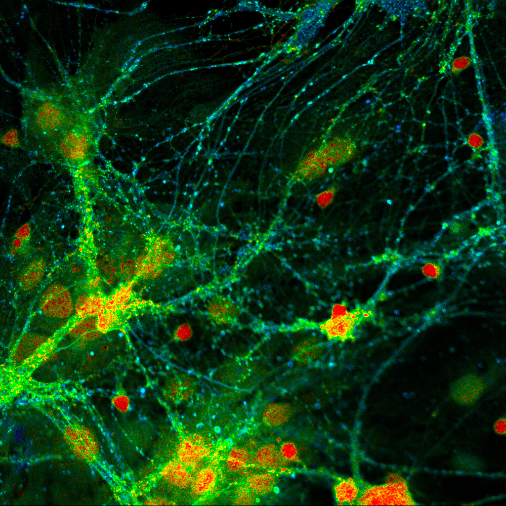 Presynaptic Bassoon and postsynaptic Homer clusters in fixed neurons visualized by fluorescence lifetime imaging (FLIM), where color encodes lifetime contrast rather than intensity-based staining. Sample courtesy of Rizzoli group, Department of Neuro- and Sensory Physiology, University of Göttingen Medical Center.FLIM delivers contrast from nanosecond lifetimes rather than intensity, so results are largely independent of probe concentration, excitation power, and moderate photobleaching. Lifetime is sensitive to the local environment, including pH, ions, oxygen, polarity, and quenching, which enables functional readouts that intensity imaging can miss. FLIM also helps separate spectrally similar labels and suppress autofluorescence. The outcome is quantitative, reproducible lifetime maps that work across confocal and two-photon setups and remain robust in complex, heterogeneous samples.