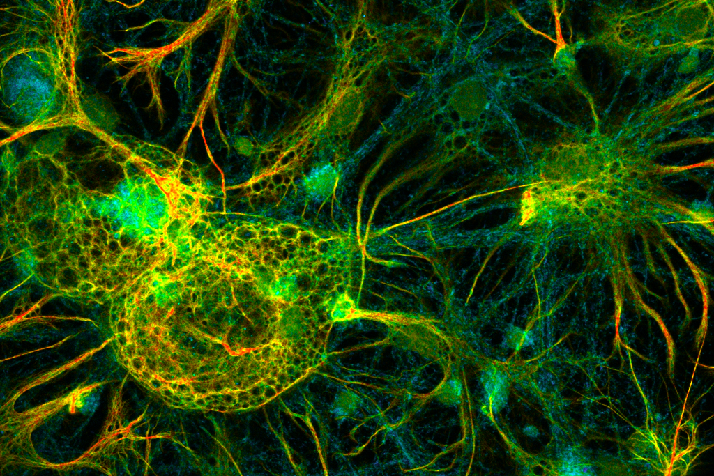 FLIM image of fixed primary neuronal cells stained for synapses (PSD95), intermediate filaments (GFAP), and mitochondria (TOM20). Sample courtesy of the Rizzoli Group, Department of Neuro- and Sensory Physiology, University of Göttingen Medical Center.Fluorescence lifetime measurements in FLIM are commonly performed using time-correlated single photon counting (TCSPC). In this method, fluorophores are excited by short, repetitive laser pulses, and the arrival time of each emitted photon is recorded relative to the excitation pulse. Repeating this process over many cycles generates a histogram of photon arrival times at each pixel, where photon counts are accumulated into discrete time bins with picosecond resolution. This histogram represents the fluorescence decay profile.