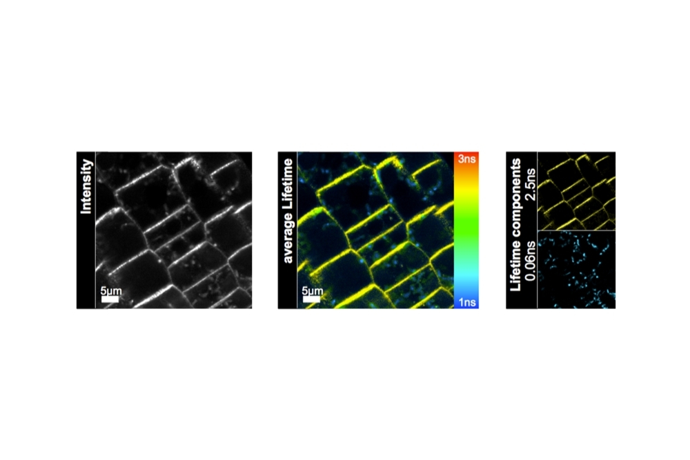 FLIM enables discrimination between spectrally overlapping fluorophores by incorporating lifetime contrast. In Arabidopsis root cells expressing GFP-tagged PIN2, lifetime analysis separates GFP fluorescence from intrinsic autofluorescence. Measurements were performed on a MicroTime 200 system, demonstrating robust label separation through multi-component lifetime fitting.