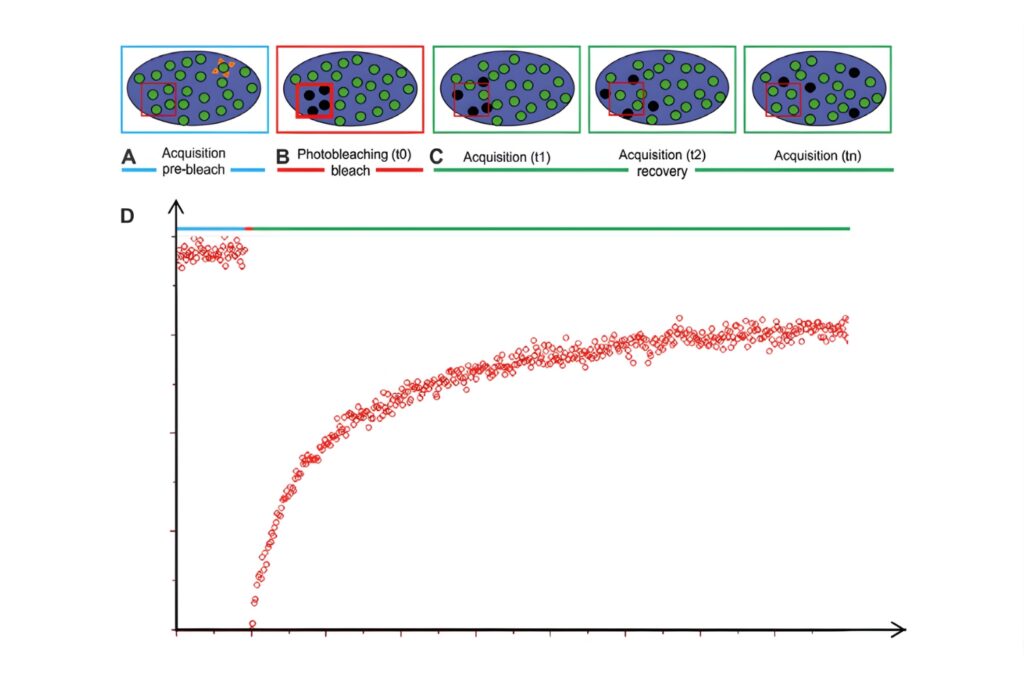 Fluorescence Recovery After Photobleaching (FRAP) is a fluorescence microscopy technique used to quantify the mobility and kinetic behavior of molecules within a sample, most commonly in living cells. It relies on the controlled photobleaching of fluorescently labeled molecules within a defined region, followed by observation of fluorescence recovery caused by the movement of unbleached molecules into that region.