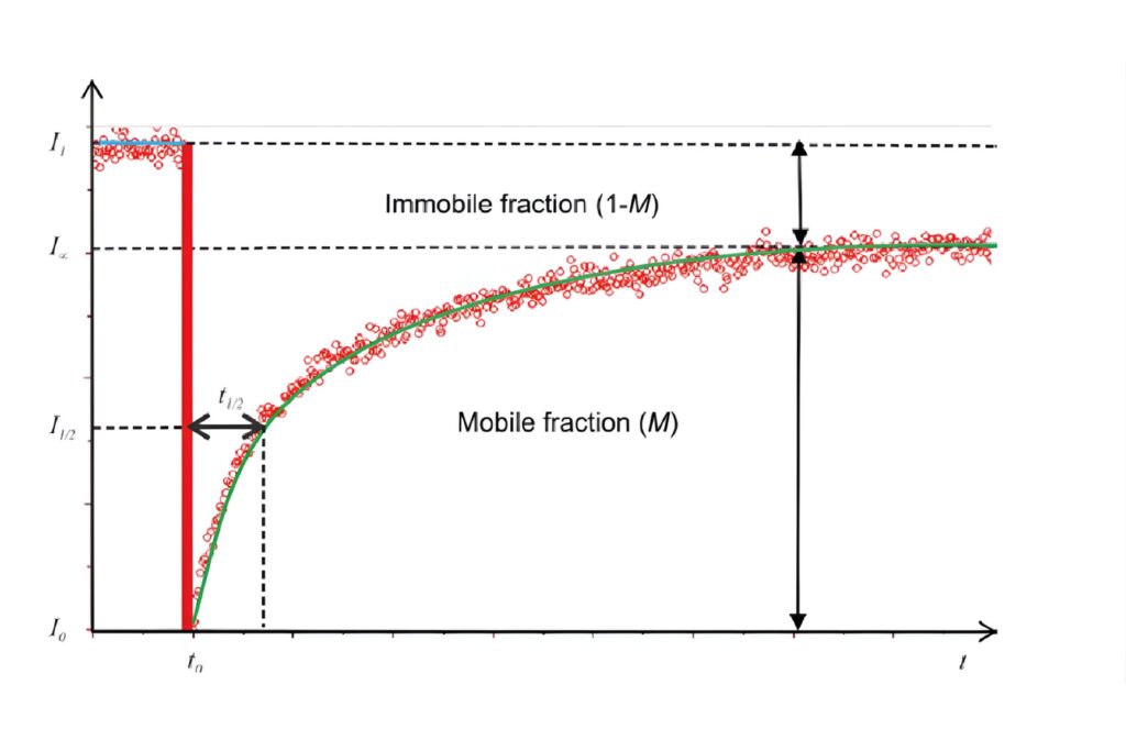 FRAP recovery curve illustrating half-time of recovery and separation of mobile and immobile molecular fractions.The fluorescence recovery curve is central to FRAP analysis. It describes how fluorescence intensity changes over time within the bleached region. Key parameters include: