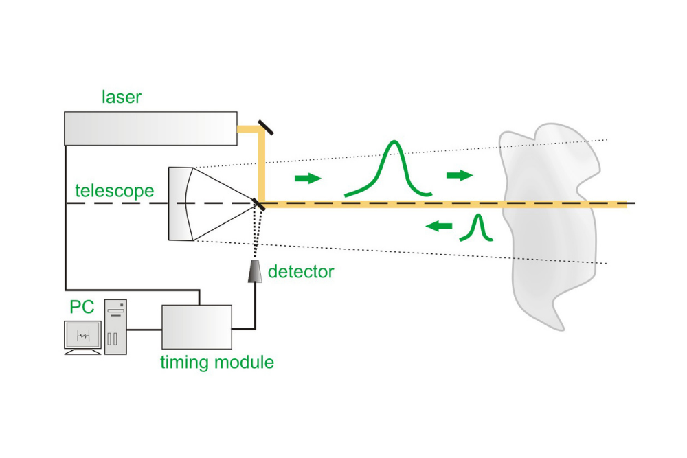 Schematic of a time-of-flight LiDAR system showing laser emission, photon detection, and timing-based distance calculation.LiDAR systems emit short laser pulses toward a target and record the arrival time of reflected photons relative to the emission event. The measured time-of-flight is converted into distance using the known speed of light. Repeated measurements enable accurate ranging and, in scanning systems, spatial mapping. While laser ranging applies this principle to point-to-point distance measurements, SLR extends it to Earth–orbit distances, requiring extremely precise timing, synchronization, and time-resolved photon detection.