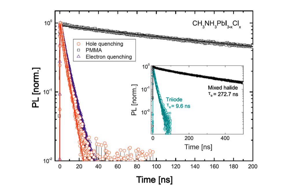 Selective electron and hole transport layers were used in TRPL quenching experiments to determine diffusion lengths in mixed-halide and triiodide perovskite films. Distinct decay dynamics correlate with charge-carrier transport and device efficiency. Measurements were performed using the FluoTime 300 photoluminescence spectrometer.