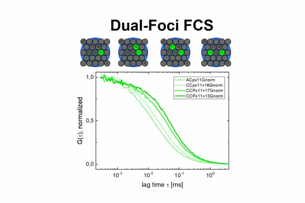 Dual-foci fluorescence correlation spectroscopy (FCS) using selected SPAD array pixel pairs. Cross-correlation curves reveal diffusion dynamics and spatial relationships between detection volumes.Integrating a SPAD array into time-resolved fluorescence measurements provides immediate access to pixel-wise correlations, varying detection volumes, and lifetime-resolved information. Using PDA-23, approaches like Spot Variation Fluorescence Correlation (Lifetime) Spectroscopy (svF(L)CS), multi-foci FCS, and advanced diffusion analysis become feasible without altering the optical setup, enabling broader experimental exploration from a single dataset.