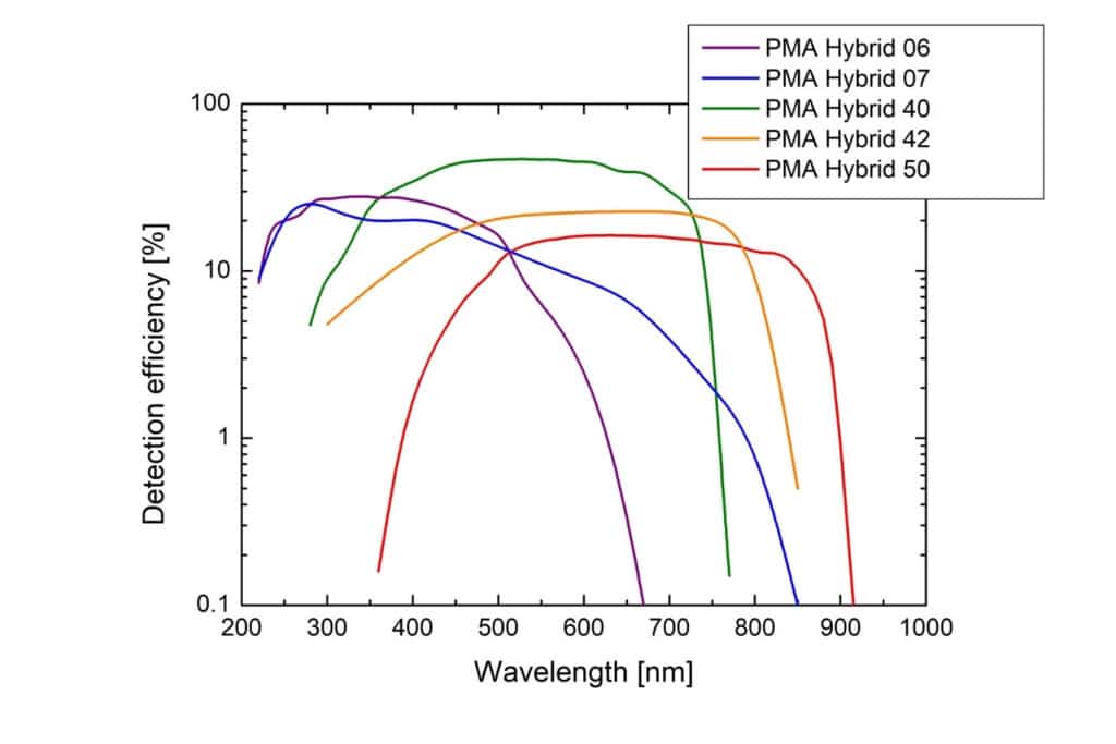 Detection efficiency curves of the different photocathodes available for the PMA Hybrid Series, covering spectral ranges from the UV to the NIR.PMA Hybrid Series combines large area hybrid photomultiplier technology (PMTs) with sensitivity of single-photon avalanche diodes (SPADs). With timing precision down to 20 ps, negligible afterpulsing, and detection efficiencies up to 45 %, these detectors enable reliable photon counting in demanding TCSPC, FLIM, and correlation applications. Each module integrates temperature stabilization, RF shielding, and all required electronics for effortless operation and seamless compatibility with PicoQuant systems, spectrometers, and laser scanning microscopes. These capabilities make the PMA Hybrid Series an ideal choice for FCS, FLIM, FRET, TRPL, LiDAR, and other advanced photon-counting workflows.