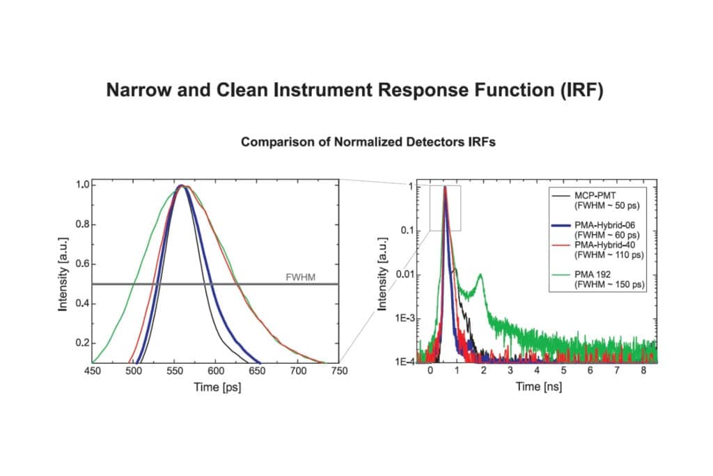 Comparison of normalized instrument response functions (IRFs) of different photon-counting detectors, highlighting the narrow timing response and clean decay behavior of hybrid photomultiplier detectors.Hybrid photomultiplier detectors combine fast timing, low noise, negligible afterpulsing and dead time-free detection in a way that is difficult to achieve with conventional detector technologies. These characteristics enable reliable photon counting under demanding conditions, including high count rates and time-resolved measurements where detector-related artifacts can otherwise limit accuracy.