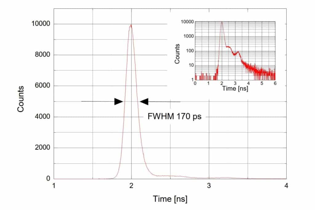 Measured instrument response function demonstrating a timing resolution of 170 ps FWHM.PMA 175 | PMA 192 | |