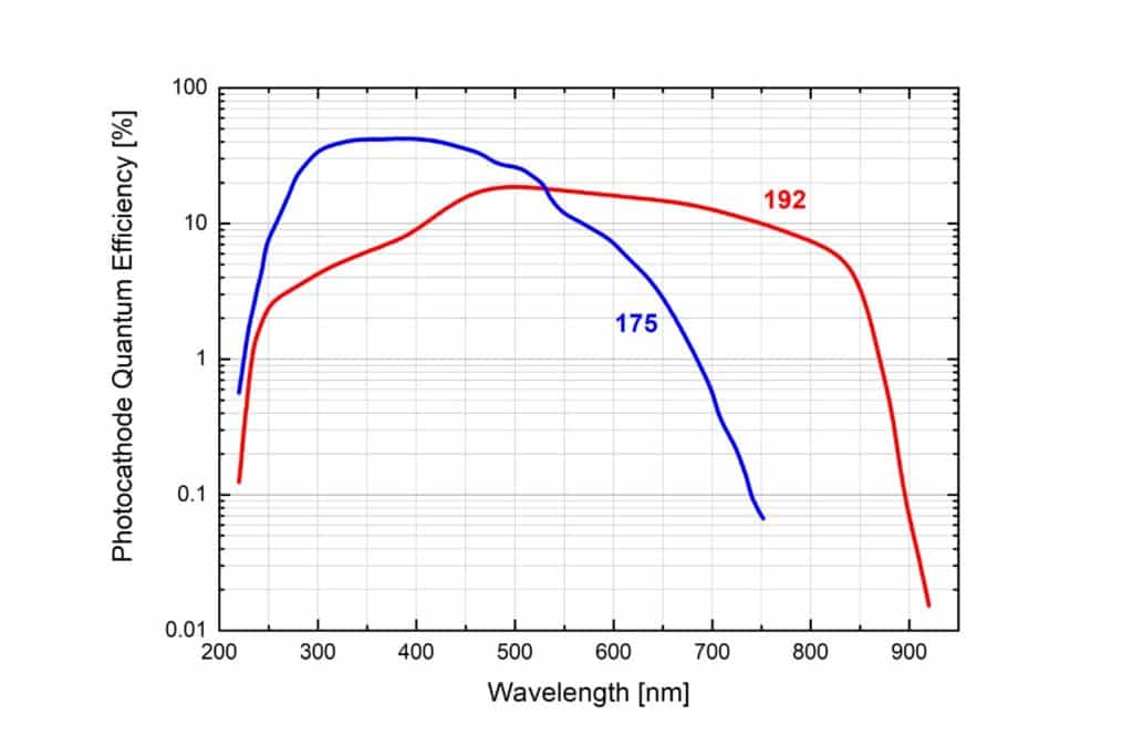 Photocathode quantum efficiency of the photomultiplier detector assemblies from the PMA Series.PMA Series combines single-photon sensitivity, fast temporal response, and low noise in a fully integrated photomultiplier detector assembly designed for demanding photon-counting workflows. Each unit incorporates a high-performance PMT, high-voltage supply, and optimized preamplifier within a robust, RF-shielded housing designed for stable operation in complex laboratory environments. Users can choose between blue-sensitive or extended-red photocathodes covering 230–920 nm, with optional thermoelectric cooling for reduced dark counts. With integrated shutter options, overload protection, and simple 12 V operation, the PMA Series delivers reliable performance for LiDAR, TRPL, FLIM, FRET, and other time-resolved measurement techniques.