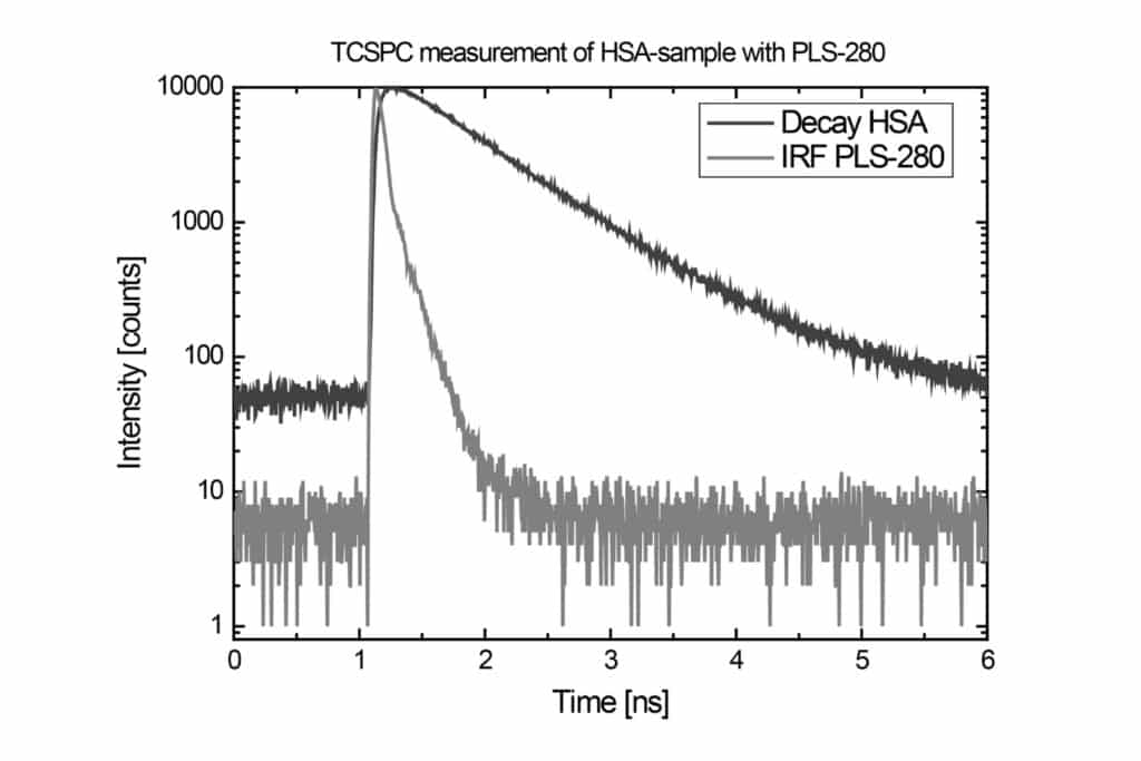 TCSPC measurement of a human serum albumin (HSA) sample using the PLS-280 pulsed LED excitation source. The instrument response function shows a pulse width of about 800 ps, typical for LED-based excitation. Lifetimes below 250 ps are therefore difficult to resolve accurately, and the lower excitation power leads to acquisition times of about 12 minutes for the decay.With LED wavelengths spanning the UV to the visible range and delivering fast, stable sub-nanosecond pulses, the PLS Series adapts easily to different scientific fields. Their performance supports applications in life sciences, materials science, metrology, and quantum technologies, enabling robust excitation for a wide variety of time-resolved methods.