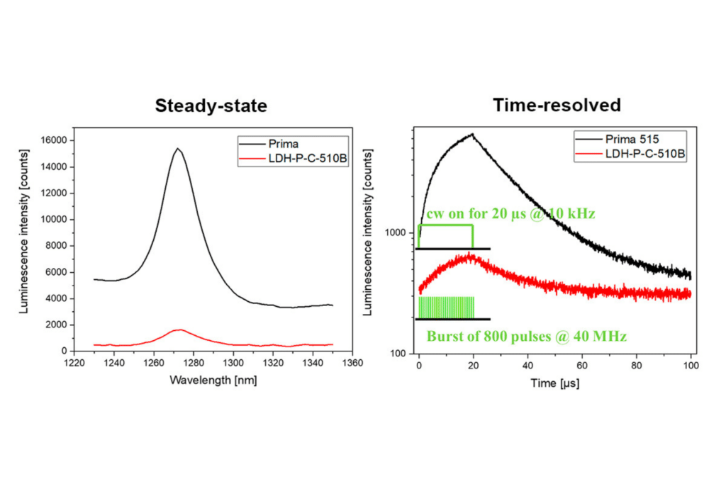 Comparison of steady-state and time-resolved luminescence measurements using burst and CW excitation, highlighting the precise timing control of the Prima picosecond laser for complex excitation schemes.Prima unlocks advanced excitation schemes without the need for complex multi-driver setups. Its flexible timing architecture supports burst sequences, pump–probe workflows, and other custom pulse patterns. Internal and external triggering up to 200 MHz ensures precise synchronization with detectors, scanners, or TCSPC electronics. Whether you are mapping fast photophysics, separating species in single-molecule assays, or probing long-lived states, Prima makes sophisticated excitation patterns easy to set up and reproducible in daily operation.