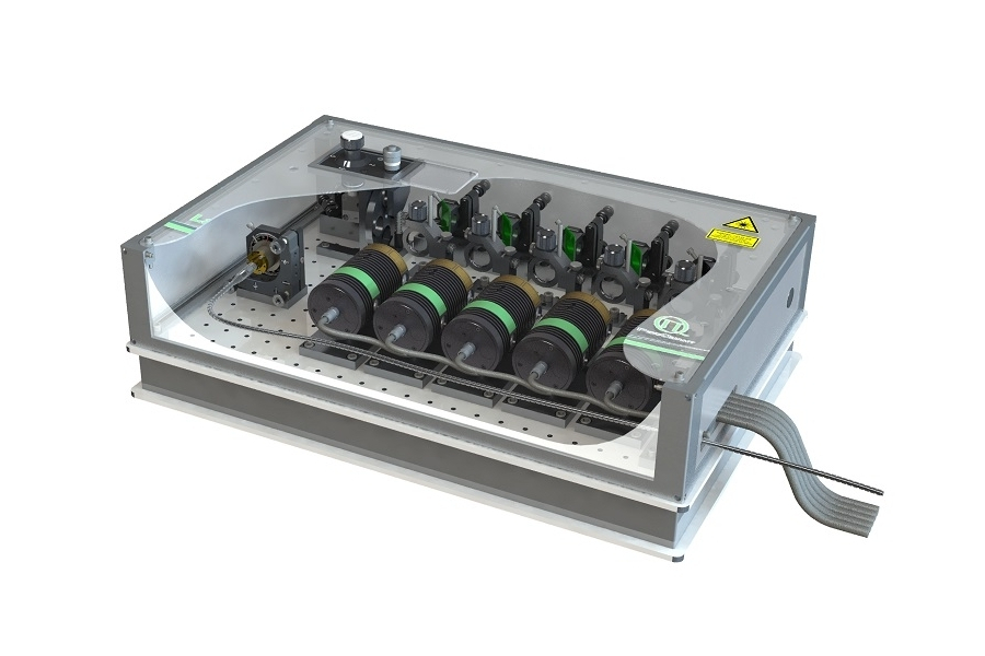 Laser Combining Unit (LCU) integrating multiple picosecond laser heads for fiber-coupled excitation.The Laser Combining Unit allows you to merge the output of up to five compatible laser heads into a single polarization maintaining single mode fiber.