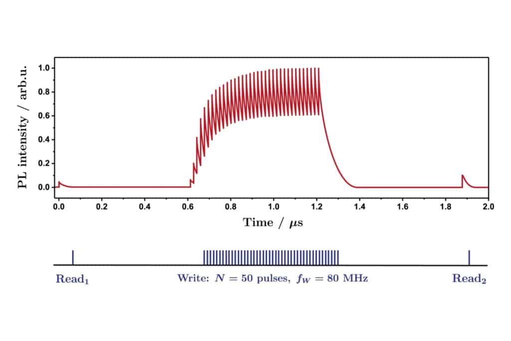 Read–Write–Read burst sequence generated by the Sepia PDL 828 and the SOM 828-D oscillator module, enabling controlled population and probing of hidden states in time-resolved photoluminescence experiments. Demonstrated here for trapped carrier dynamics in a CsPbBr₃ microplate. Image courtesy of Ivan Scheblykin, Lund University, Sweden.Advanced burst control enables tailored excitation schemes for materials with long-lived or hidden non-radiative states, where conventional repetition rates fail to capture relevant dynamics. Using the burst mode of the Sepia PDL 828, complex pulse sequences such as the Read–Write–Read approach can be implemented. These sequences are generated and precisely timed by the SOM 828-D oscillator module, which provides programmable delays and reliable synchronization across channels. A controlled burst of write pulses prepares a quasi steady state, followed by delayed readout pulses to probe carrier trapping and relaxation dynamics in time-resolved photoluminescence experiments.