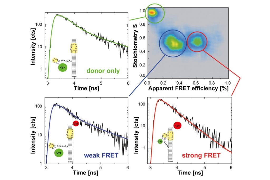Single-molecule FRET analysis of freely diffusing RNA using pulsed interleaved excitation (PIE). The experiment probes interactions between a GAAA tetraloop motif (Cy3 donor) and its receptor region (Cy5 acceptor). A 2D plot of FRET efficiency versus stoichiometry reveals distinct molecular subpopulations for further analysis. Data courtesy of Julie Fiore and David Nesbitt, University of Colorado Boulder, USA.In Pulsed-Interleaved Excitation (PIE) two laser pulses are used sequentially to excite donor (D) and acceptor (A) molecules independently. The resulting fluorescence emission patterns can be used to discriminate between molecules showing Förster Resonance Energy Transfer (FRET) and molecules that don’t as well as indicate the absence of A.
