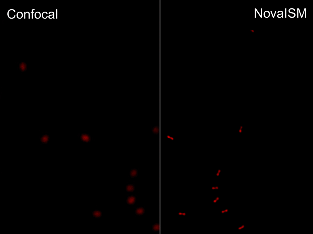 Comparison of confocal imaging and NovaISM analysis using GATTA-SIM 160 nm nanorulers shows sharper structures and improved separation of fine features.
