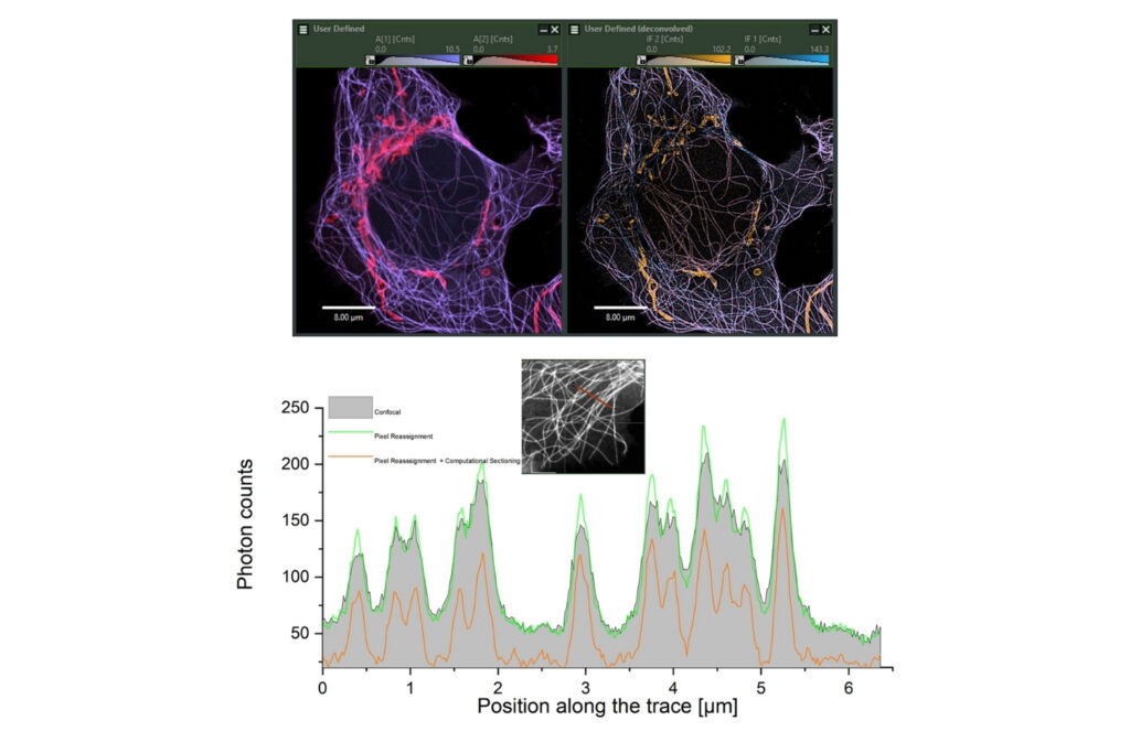 The computational sectioning is based on an unmixing of the intensity distribution over the PDA-23  detector array.  This process allows for rejection of light coming from out-of-focus planes which in thicker samples can be problematic as it limits the contrast, produces artifacts in the deconvolution process and interferes in the lifetime –species determination.  With computational sectioning offered by NovaISM all these problems are resolved.