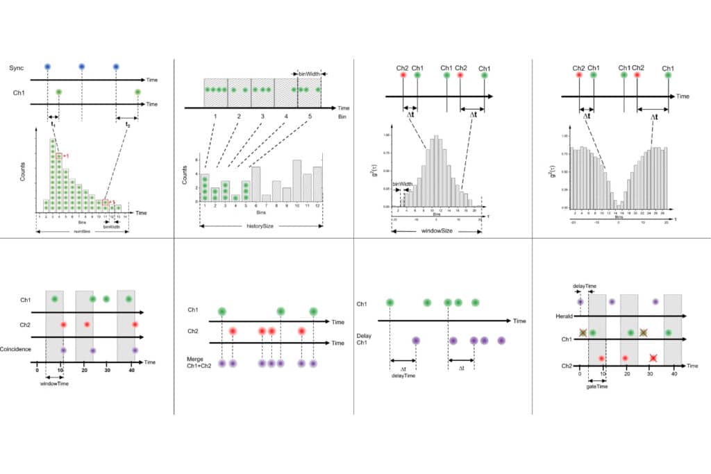 Overview of the measurement classes and real-time manipulators available in UniHarp and accessible via snAPI. Measurement classes define the acquisition workflow for photon data (e.g., Histogram, Time Trace, Correlation), while manipulators process photon streams during acquisition, enabling operations such as coincidence detection, channel merging, timestamp delays, or heralded event filtering. Together, they form a flexible framework for designing complex time-resolved photon experiments.snAPI provides a set of high-level measurement classes for efficient data acquisition in time tagging and TCSPC experiments. Histogram measurements analyze temporal kinetics and excited-state dynamics, while Time Trace records intensity variations over time to study processes such as blinking or signal stability. Correlation analysis supports auto- and cross-correlation workflows, including g² and FCS measurements for investigating photon statistics and dynamic interactions. For advanced use cases, Unfold provides direct access to photon timing information, and the RAW class exposes the complete time-tag stream for fully customized analysis pipelines.