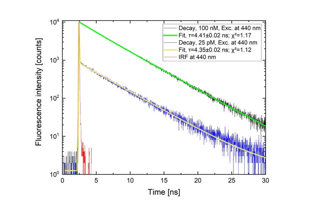 Fluorescence lifetime decays of Fluorescein with a concentration of 100 nM (black) or 25 pM (blue) acquired at 516 nm after excitation with 440 nm. Fluorescence lifetimes obtained from reconvolution fit are indicated in the legends.Working with precious samples often feels like a compromise between sensitivity and conservation, but this application note shows that it does not have to be. With only a few microliters, FluoTime 250 delivers reliable fluorescence and lifetime data even at picomolar concentrations. Learn how microvolume spectroscopy helps you protect valuable material, reduce reagent use and still achieve high quality results.